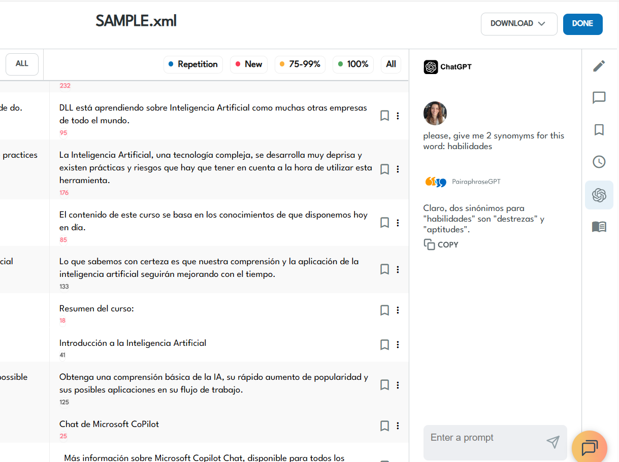 Con el tiempo, la memoria de traducción te ayudará a traducir XML más rápido y con un menor uso de tokens.